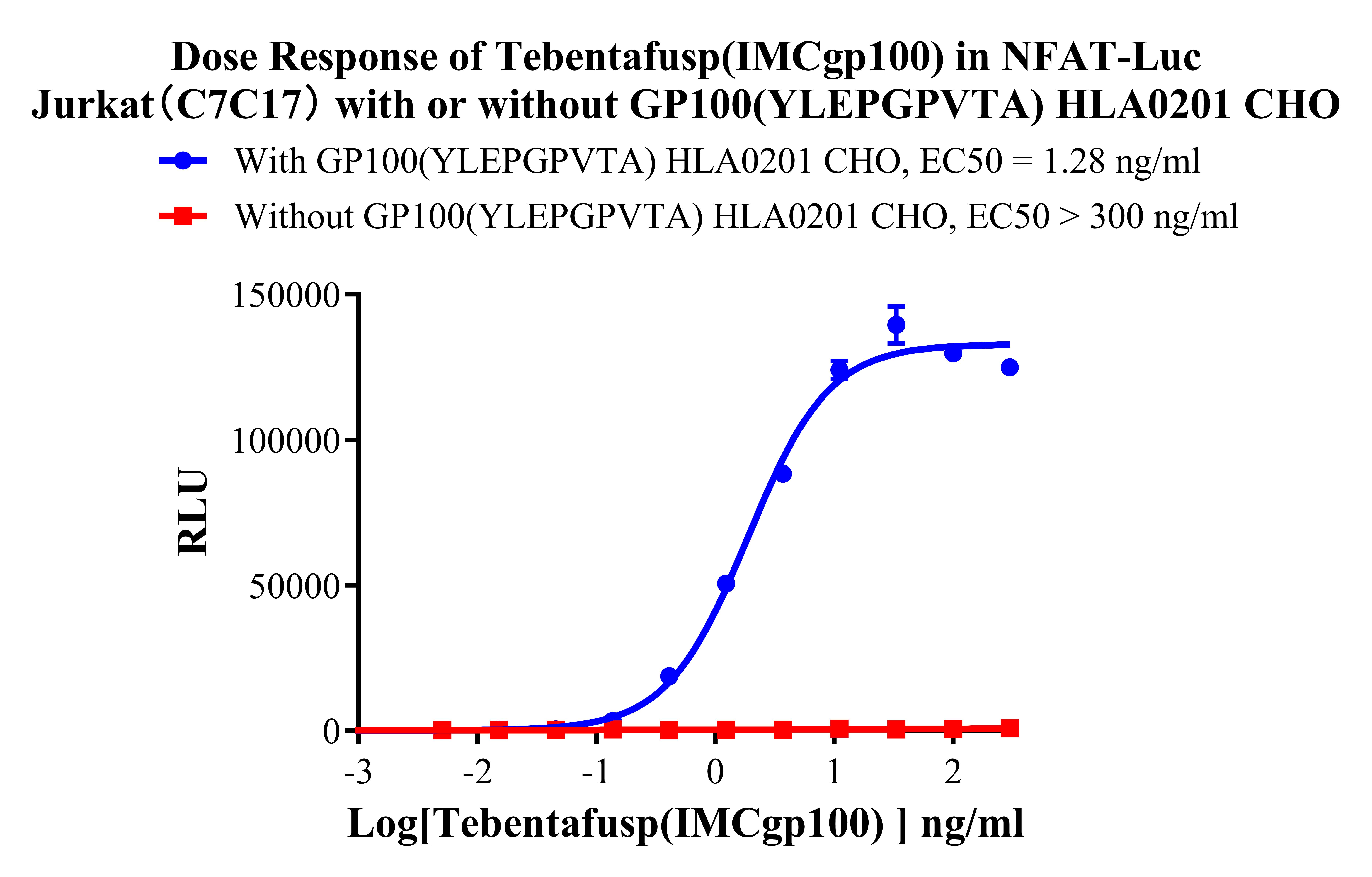 Figure 1.Dose Response of Tebentafusp (IMCgp100) in NFAT-Luc Jurkat(C7C17) with or without GP100(YLEPGPVTA) HLA0201 CHO. |