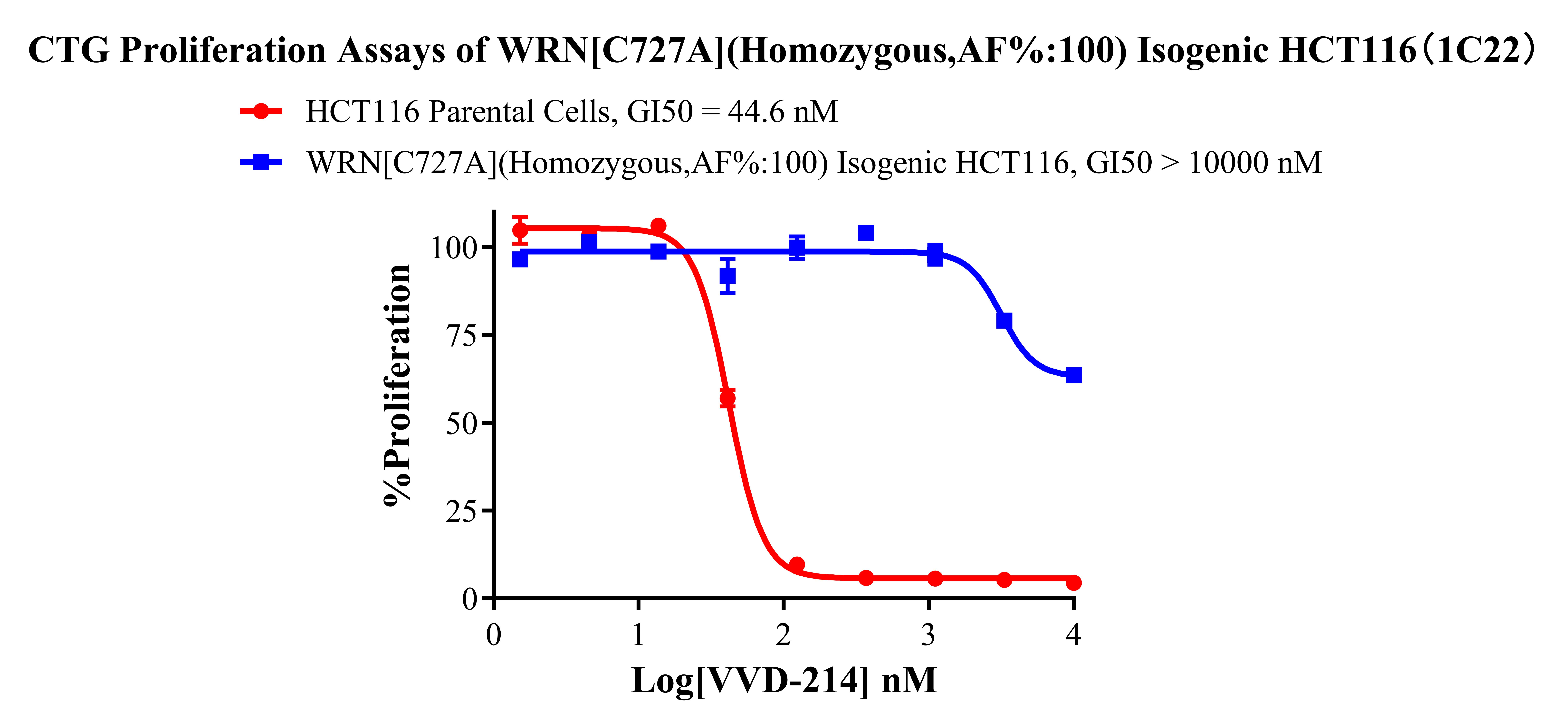WRN[C727A](Homozygous,AF%:100) Isogenic HCT116 藥靶細(xì)胞,通過(guò) 基因編輯的方式將 WRN 的 727 位氨基酸胱氨酸(C)突變?yōu)楸彼幔ˋ)。![]() Figure 1. WRN[C727A](Homozygous,AF%:100) Isogenic HCT116 原理示意圖 |