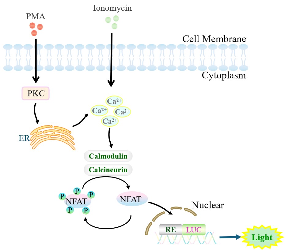 NFAT-Luc CHO 報告基因藥靶模型很好的模擬了體內(nèi) NFAT 的信號轉(zhuǎn)導過程,原理見下圖所示。
