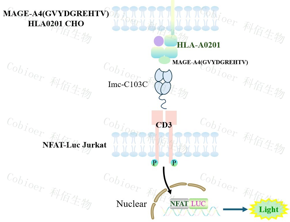 HLA-A*0201-MAGEA4 復(fù)合物是人類白細(xì)胞抗原(HLA)Ⅰ類分子與 MAGEA4 抗原肽的復(fù)合體,屬于主要組織相容性復(fù)合體(MHC)Ⅰ類家族成員。該復(fù)合物常用于 T 細(xì)胞 受體(TCR)療法,通過激活 T 細(xì)胞以識別并殺傷腫瘤細(xì)胞,原理見下圖所示。![]() Figure 1. MAGE-A4(GVYDGREHTV) HLA0201 CHO 細(xì)胞模型圖 |