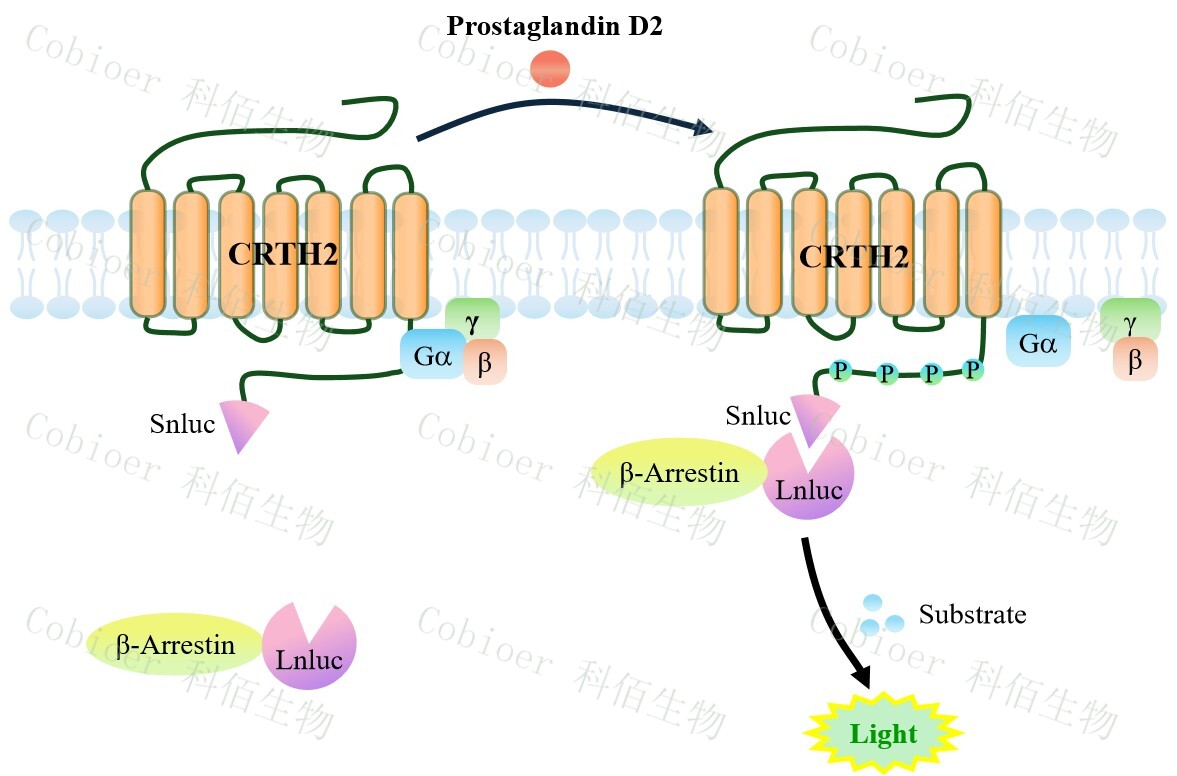 CRTH2(DP2) β-Arrestin CHO 報告基因藥靶模型很好的模擬了體內(nèi) CRTH2(DP2)/β- Arrestin 的信號轉(zhuǎn)導(dǎo)過程, 原理見下圖所示。 當(dāng)缺乏配體刺激時 , β-Arrestin 不與 CRTH2(DP2)結(jié)合,融合β-Arrestin 的熒光素酶處于失活構(gòu)象,當(dāng) CRTH2(DP2)遭遇配體刺 激時,融合熒光素酶報告基因的β-Arrestin 被招募,使熒光素酶報告基因處于激活狀態(tài),加 入其底物后發(fā)光信號增強。![]() Figure 1. CRTH2(DP2) β-Arrestin CHO 細胞模型原理圖 |