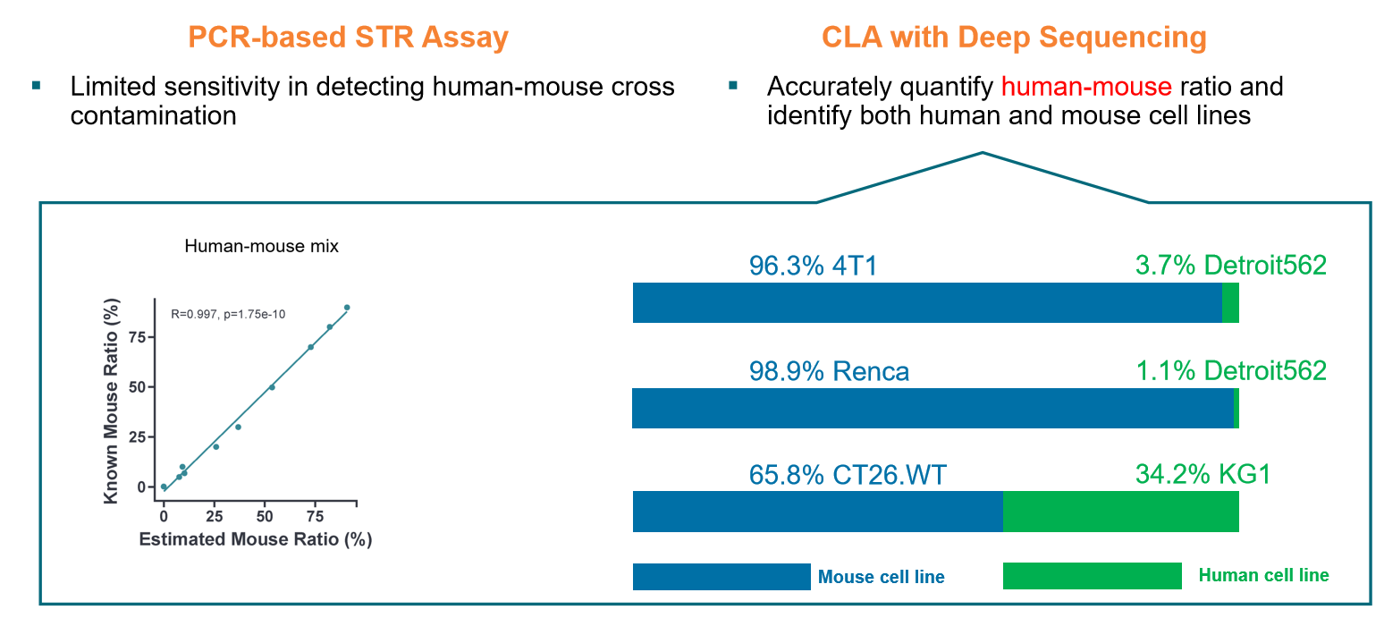 基于靶向測序600+ SNP位點及染色體片段的深度測序(3000X覆蓋)與智能分析,深度測序(CLA with Deep Sequencing)技術(shù)可同步實現(xiàn)細胞系高精度鑒定、微量污染檢測(1%靈敏度)及多維度遺傳解析。